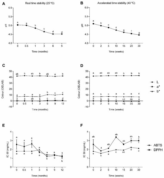 Results of pH value, color, and antioxidant capacity (ABTS and DPPH) of the ingredient (mean ± SD) (n = 3) during real-time (25 °C, 65% RH) and accelerated (40 °C, 65% RH) stability conditions. Different letters indicate statistical differences (p < 0.05) along storage. pH values during real-time (A) and accelerated (B) stability conditions, CIELAB colour during real-time (C) and accelerated (D) stability conditions, antioxidant activity during real-time (E) and accelerated (F) stability conditions.