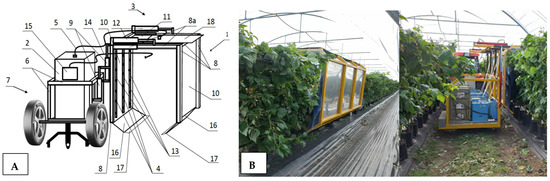 Designed and implemented system for raspberry plant fumigation connected to an agricultural tractor. (A) Conceptual diagram, (B) Picture of prototype system during O3 gas fumigation procedure. NOTE: (1)—fumigation device, (2)—ozone generator, (3)—fumigation chamber, (4)—set of nozzles, (5)—ozone supply hose, (6)—support structure, (7)—mobile carriage, (8)—device frame, (8a)—extendable part of device frame, (9)—vertical actuator, (10)—side walls, (11)—upper wall, (12)—horizontal actuator, (13)—ozone distribution pipe, (14)—suction hose, (15)—ozone concentration sensor, (16)—cover, (17)—comb, (18)—retractable upper cover.