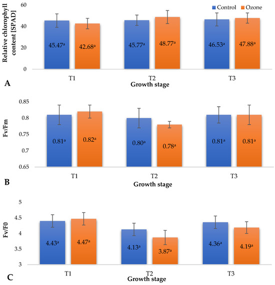 Plants’ ability to photosynthesize is directly linked to the amount of chlorophyll [18]. Under various biotic and abiotic stress conditions, such as drought, tissue damage due to pest feeding, or the presence of pathogenic microorganisms, a decrease in chlorophyll content occurs. This phenomenon is often observed in the form of chlorosis, characterized by yellowing of the leaf blade. Reduced chlorophyll content adversely affects the plants’ ability to carry out efficient photosynthesis, leading to restricted growth, development, and fruit yield [19]. Chlorophyll fluorescence parameters, such as Fv/Fm (maximum photochemical efficiency of photosystem II), can serve as indicators not only of photosynthetic efficiency but also of plant health and the presence of stress factors [20]. Figure 2 illustrates the impact of the applied process of fumigating raspberry plants with ozone gas as a supporting measure against pathogenic microorganisms, mainly fungi, on selected physiological parameters of raspberry plants (Figure 2A—Relative content of chlorophyll (SPAD), Figure 2B—Maximal photochemical efficiency of PSII (Fv/Fm), Figure 2C—Maximum quantum yield of primary photochemistry (Fv/Fo)). Analysing the obtained measurement results, no significant changes in the examined parameters were observed after the ozone fumigation treatment of raspberry plants. Ozone, as a strong oxidizing agent, affects the condition of plants, especially during prolonged exposure. This effect, as demonstrated by Rani et al. [21], is mainly associated with the occurrence of photochemical smog, in which plants face prolonged exposure to low concentrations (ppb) of ozone, resulting in impairment of their photosynthetic apparatus. This effect was historically measured through chlorophyll content, but it has been shown that a more reliable method is the measurement of its fluorescence, in which selected parameters indicate the onset of oxidative stress induced by ozone. After prolonged exposure of plants to this gas, plants, especially their green organs, show signs of damage, such as chlorosis and necrosis. In the case of the examined raspberry plants cyclically exposed to short-term (7 s for each plant) application of relatively high concentrations of gaseous ozone (5 ppm), no phytotoxic effects were observed (no necrosis or chlorosis). Recorded results of relative chlorophyll content (SPAD) in raspberry leaves (Figure 2A) showed statistically nonsignificant changes in the content of this pigment in the leaves, which may be due only to the different developmental phases of the plants (between treatment dates) and applied agrotechnical treatments (fertigation, irrigation, etc.). Similar results were noted for the maximal photochemical efficiency of PSII (Fv/Fm) (Figure 2B) and maximum quantum yield of primary photochemistry (Fv/Fo) (Figure 2C). However, in the case of Fv/Fo, greater variations in the values of this parameter were recorded between raspberry plants from the control group (not subjected to O3 fumigation) and cyclically ozonated plants compared to the parameter Fv/Fm. It should be emphasized that the Fv/Fo parameter is a more sensitive indicator of plant stress, which directly affects PSII. Due to the lack of correlation between the measured values and carbon assimilation, it allows the detection of stress earlier than in the case of Fv/Fm measurement [22]. The values of Fv/Fo recorded at T2 for raspberry plants fumigated with gaseous O3 indicate the occurrence of a stress response. This was the only parameter that indicated any influence of applied ozone on the plants. However, this influence was not phytotoxic. Plants subjected to stressful factors activate a series of defence mechanisms. The action of oxidizing agents, especially reactive oxygen species (ROS), activates enzymes that decompose hydrogen peroxide (CAT) and superoxide anion radicals (SOD). Additionally, other biochemical pathways may be activated (phenylalanine ammonia-lyase (PAL)), triggering increased biosynthesis of selected bioactive compounds from the group of small-molecule antioxidants in various parts of plants, including produced fruit [23]. An increase in the content of these compounds in raw plant materials as a result of exposure to O3 can be observed until the onset of phytotoxic effects.