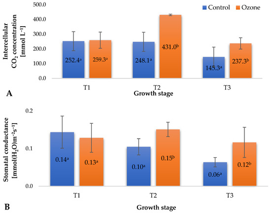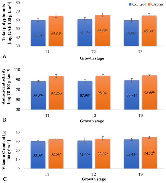 Raspberry fruits are a valuable source of phenolic compounds, the composition of which is a characteristic feature and is usually consistent for a given chemotype. As shown in Figure 4A, the use of a treatment to support the growth and development of plants with gaseous ozone fumigation altered the total content of phenolic compounds in the harvested fruits. Due to the lack of selectivity of the utilized Folin–Ciocalteu method, fruits collected at time point T3 were analysed to determine the phenolic compound profile (Table 1). The data from MS made it possible to calculate the content of each compound. The percentage composition of the mixture was determined using the UPLC-MS method, and the total content of phenolic compounds using the Folin method. This analysis aimed to determine whether the plants exposed to gaseous ozone fumigation merely intensified their production of this group of compounds in the produced fruits or whether selected metabolic pathways leading to the biosynthesis of specific phenolic compounds were modified. The analysis of the obtained results indicates that the differences observed were solely due to the standard error of the applied analytical method. The main phenolic compound identified in the fruits collected from both ozonated and control raspberry plants was cyanidin 3-O-sophoroside. The remaining analysed compounds were at the same level, as confirmed by the statistical analysis. The only difference was observed in the content of Cyanidin 3-O-glucoside, which is presumably formed by enhanced hydrolysis of one glycoside bond in cyanidin 3-O-sophoroside. Presumably, the increased biosynthesis of these compounds was associated with the non-selective activation of biochemical systems generating phenolic compounds. This is a typical effect of using ozone as an abiotic elicitor [30]. As demonstrated in the work of Sachadyn-Król et al. [31], the activation of phenylalanine ammonia-lyase (PAL) by gaseous ozone results in enhanced biosynthesis of phenolic compounds with a qualitative composition characteristic of the given plant.