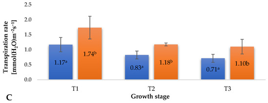 Selected gas exchange parameters in raspberry plants depending on the applied protection method in three designated periods (beginning of fruiting (T1), full fruiting (T2), and final fruit harvest (T3)). NOTE: Significant differences between results are indicated by different letters (n = 36); significant differences are defined by the criterion p < 0.05. (A) Intercellular CO2 concentration (Ci). (B) Stomatal conductance (gs). (C) Transpiration rate (E).