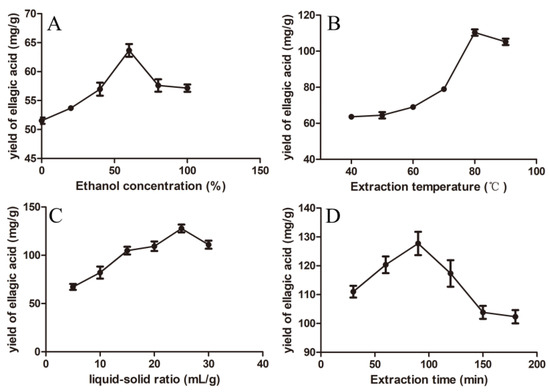 Effects of different factors on ellagic acid from CF. (A) Ethanol concentration, (B) extraction temperature, (C) liquid–solid ratio, and (D) extraction time.