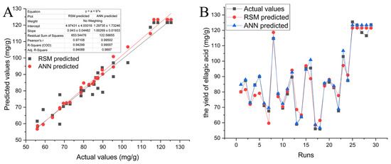 Relationship between the actual vs. predicted values using the RSM and ANN models (A); the matching between all the datasets (B).