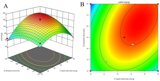 Response surface (3D, (A)) and contour plots (2D, (B)) showing extraction yield of ellagic acid (EA) as a function of the (X3) liquid–solid ratio and (X4) extraction time.