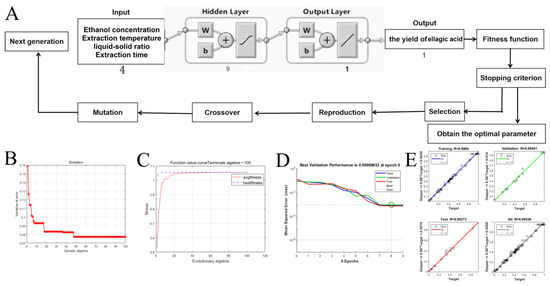 In the present study, the available experimental data from the RSM experiment were used for modeling the extraction of EA from CF using a multilayer perceptron-based feed-forward ANN in conjunction with GA optimization. The exact BP neural network architecture featured an input layer with four neurons (ethanol concentration, extraction temperature, liquid–solid ratio and extraction time), an output layer of one neuron (EA yield) and a hidden layer comprising nine neurons (Figure 5A). Traingdm was selected as the training parameter, and Mean Square Error (MSE) was utilized to assess the model’s precision. Several critical settings, predominantly the learning rate, momentum coefficient, number of epochs, and the configuration of hidden layers, were pivotal in influencing the neuronal simulation. The recommended momentum coefficient, learning rate, and hidden layer values of 0.7, 0.1 and 13, respectively, were used in this study to calculate the weights [38]. The GA optimization, integrated with the database and the ANN model trained via BP, delineated the optimal conditions yielding the maximum EA content. The average fitness values for each generation within the population were calculated using MATLAB R2019b software, with parameters set for the population size, maximum evolutionary algebra, crossover probability, mutation probability, and generation gap at 40, 100, 0.7, 0.1 and 0.95, respectively (Figure 5B,C). All computational analyses were performed using the Neural Network Toolbox of MATLAB version 9.10.0 (R2021a).