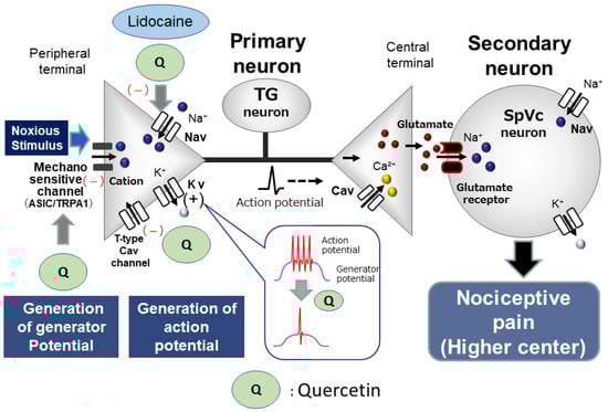 Toyota et al. [] investigated the impact of the local administration of quercetin in rats to determine if it reduces the excitability of nociceptive TG neurons in vivo in response to mechanical stimulation. They found that (i) the mean firing rate of TG neurons in response to both non-noxious and noxious mechanical stimuli is dose dependently reduced by a local injection of quercetin; (ii) quercetin inhibition of the discharge frequency in response to both non-noxious and noxious mechanical stimuli is reversible; and (iii) a local injection of a vehicle has no significant effect on non-noxious or noxious mechanical stimulation-evoked TG neuronal activity. These findings are in agreement with previous in vitro studies, in which 0.1 mM quercetin was found to inhibit Nav currents in rat cardiac myocytes []. Surprisingly, the mean magnitude of TG neuronal discharge frequency inhibition is almost equal between quercetin (10 mM) and 2% lidocaine (74 mM), indicating that the potency of quercetin is seven folds higher than 2% lidocaine. These findings are supported by evidence in rat cardiac myocytes, using a whole-cell patch clamp technique, in which the red grape polyphenols, quercetin, catechin, and resveratrol, all inhibit Nav currents, and their inhibitory potency, based on the half-maximal inhibitory concentration, is quercetin > catechin = resveratrol []. These findings indicate that injecting quercetin locally at the peripheral receptive site can inhibit the excitability of nociceptive primary sensory neurons in the TG, likely by blocking Nav channels and activating Kv channels (Figure 1). Since quercetin inhibits ASIC currents in the central vestibular neurons [], it can be assumed that the local administration of quercetin works through ASICs as candidates for mechanoreceptors in the nerve terminals of TG neurons [,]. Therefore, the local administration of quercetin directly inhibits generator potentials, and, subsequently, suppresses the action potential firings of nociceptive TG neurons (Figure 1). The potency of quercetin is almost equal to that of the Nav channel blockers, such as the commonly used local anesthetic, lidocaine.