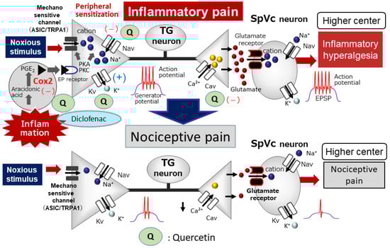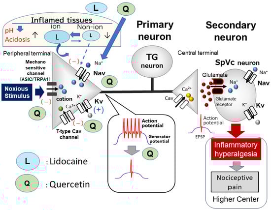 Recently, Sashide et al. [] reported that a local injection of quercetin into the peripheral receptive field of rats suppressed the excitability of nociceptive primary sensory neurons in TG neurons as follows. (i) The mean firing frequency of TG neurons in response to both non-noxious and noxious mechanical stimuli was reversibly inhibited by quercetin in a dose-dependent manner; (ii) the mean firing frequency of inflamed TG neurons in response to mechanical stimuli was reversibly inhibited by the local anesthetic, 1% lidocaine (37 mM); and (iii) the mean magnitude of inhibition of TG neuronal discharge frequency with 1 mM quercetin was significantly greater than that of 1% lidocaine []. Figure 2 shows that the local application of quercetin in inflamed tissue appears to decrease the excitability of nociceptive primary sensory TG neurons by inhibiting ASICs and Nav and Cav channels while stimulating Kv channels. Therefore, under inflamed conditions, the local administration of the phytochemical, quercetin, may be a more potent local analgesic than the Nav channel blocker, lidocaine, as it inhibits the generation of both generator potentials and action potentials in nociceptive primary nerve terminals []. Therefore, quercetin plays a role in the field of CAM. However, further confirmational studies, such as in vitro patch clamp studies of dissociated fluorescently labeled TG neurons derived from the receptive field of inflammatory tissues, are needed [,].