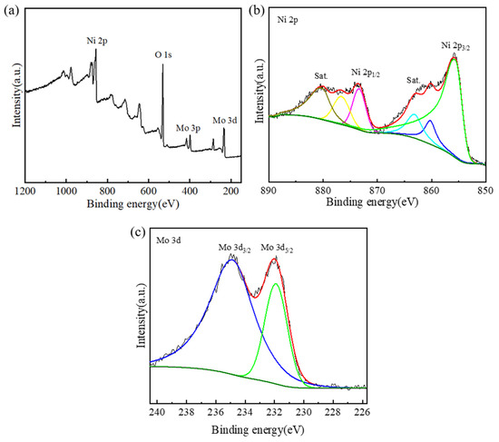 X-ray photoelectron spectroscopy (XPS) was utilized to survey the surface composition and chemical state of the as-prepared Ni-Mo-based nanoarrays. Figure 5 shows the XPS spectra of the Ni2Mo1-nanoarrays. The survey spectrum (Figure 5a) presents Ni 2p, Mo 3p, Mo 3d and O 1s peaks, which confirms the presence of Ni, Mo and O in the Ni-Mo-based nanoarrays. In Figure 5b, there are two major peaks and two satellites peaks, the major peaks at 855.8 and 873.4 eV correspond to Ni 2p3/2 and Ni 2p1/2. These peaks correspond to Ni2+ in 3Ni(OH)2·2H2O and NiMoO4 [33,34]; the small difference between the fitted XPS line and the measured line of the Ni 2p spectrum is due to the formation of Ni(OH)2, and the presence of the O 1s peak is due to the formed oxidation and the water molecules that were absorbed to the surface of the nanoarrays [35]. In Figure 5c, the Mo 3d spectrum has two peaks at 231.9 eV and 234.7 eV corresponding to Mo 3d5/2 and Mo 3d3/2, which is attributed to the Mo6+ oxidation state in NiMoO4 [36,37]. This is consistent with the results of the XRD.
