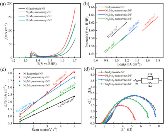 The electrocatalytic characterization of NiMo-based nanoarrays for OER was investigated by using them as working electrodes in a standard three-electrode setup in 1M KOH solution. As shown in Figure 6a, Ni2Mo1-nanoarrays/NF exhibits an overpotential of 296 mV at 10 mAcm−2, much superior to Ni-hydroxide/NF (368 mV), Ni1Mo1-nanoarrays/NF (329 mV) and Ni2Mo3-nanoarrays/NF (336 mV). This is attributed to the specific surface electronic structure of Ni2Mo1-nanoarrays/NF that is regulated through the Mo/Ni ratio [30,38]. The peaks at about 1.35 V vs. RHE correspond to the conversion of the Ni(II)/Ni(III) redox process [26,39,40].