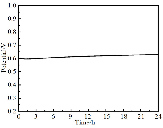 To evaluate the potential of NiMo-based electrocatalysts used for practical application, a long-term stability test is necessary. The stability of NiMo-based nanoarray electrocatalysts used for OERs was studied using chronoamperometry tests at 10 mA·cm−2 for 24 h in 1M KOH. As shown in Figure 9, a steady V-T curve over 24 h for the Ni2Mo1-nanoarrays/NF was obtained, authenticating the superior mass transportation and durability of the NiMo-based electrocatalysts [54,55]. The LSV of Ni2Mo1-nanoarrays/NF presents just a slight amplitude of potential variation after 1000 CV cycles (Figure 10a). After the OER test, Ni2Mo1-nanoarrays/NF still maintained its inherent morphology (Figure 10b) [56]. These results prove its outstanding durability.