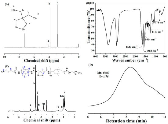 (A) The 1H NMR spectrum of the functional monomer DiSe; (B–D) FT-IR, 1H NMR spectra, and GPC trace of MPEG-b-PUSe-b-MPEG copolymers, respectively. (Letters are used solely to clearly indicate the corresponding proton po-sitions in the product structure as represented by the various proton peaks in the NMR spectrum.)