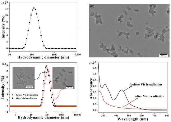 (A) DLS data and (B) the TEM image of the MPEG-b-PUSe-b-MPEG micelle solution (micelle concentration: 0.5 mg/mL); (C) the DLS data (inset: TEM images) of the MPEG-b-PUSe-b-MPEG micelles before or after Vis irradiation (micelle concentration: 0.5 mg/mL); (D) the UV-Vis spectra of the MPEG-b-PUSe-b-MPEG micelles before or after Vis irradiation.