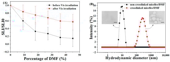 (A) Variation in relative scattered light intensity (SLI/SLI0) upon dilution by different volumes of DMF for MPEG-b-PUSe-b-MPEG micelles in the aqueous solution (initial concentration: 0.5 mg/mL) before and after Vis-irradiation. Data are shown as mean ± SD (n = 3). (B) The DLS data and TEM images of lyophilized non-crosslinked and crosslinked micelles in DMF solution (Scale bar: 200 nm).