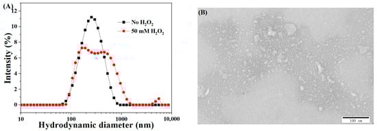 The ROS-induced disassembly behavior of CLMs was investigated via the DLS and TEM analyses. As illustrated in Figure 4A, there were pronounced size distribution changes in CLMs upon oxidative stress. The size of the crosslinked micelles was broadened to be above 1 μm with a distribution of 0.485 when exposed to 50 mM H2O2. This broadened size variation in CLMs may be possibly due to the oxidation-triggered diselenide crosslink cleavage, resulting in the formation of more hydrophilic seleninic acid groups in the micellar cores (Scheme 1) [29]. Combined with the contribution of the hydrophilic PEG shell, the entire micelles became more hydrophilic and tended to swell, dissolve, and disassemble into water-soluble polymer fragments or larger-size polymer clusters. Additionally, as shown in Figure 4B, the TEM images of the CLMs depicted unstructured or large aggregates triggered by oxidation stimulus, further confirming the aforementioned ROS-induced disassembly behavior of the CLMs.