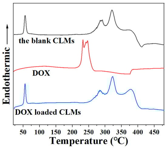 DSC thermograms of the blank CLMs, DOX, and DOX-loaded CLMs.