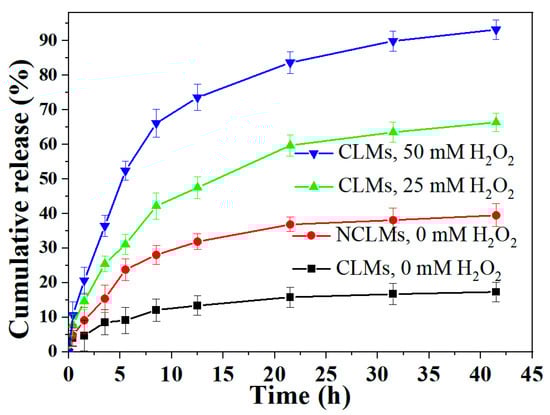 In vitro DOX release profiles of DOX-loaded NCLMs and CLMs with or without H2O2 at pH 7.4 (micelle concentration: 1 mg/mL). Data are shown as mean ± SD (n = 3).