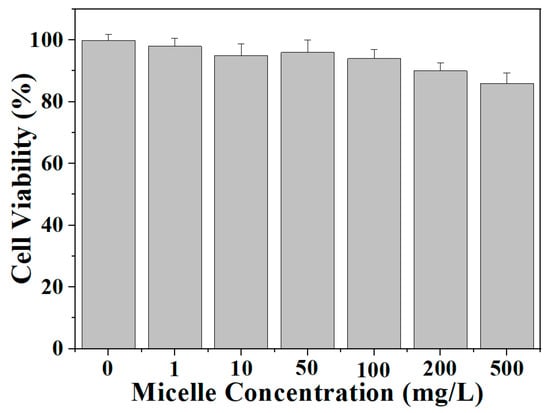 The cytotoxicities of the diselenide-crosslinked micelles were investigated using HeLa cells. As depicted in Figure 7, following a 24-h incubation period at concentrations ranging from 0 to 500 mg/L, only a slight reduction in cell viability was observed at higher concentrations, with percentages of 90% ± 2.6% and 86% ± 3.3% at 200 and 500 mg/L, respectively. These findings suggest that the diselenide-crosslinked micelles possessed satisfactory biocompatibility, allowing their safe application as nanocarriers in drug delivery systems.
