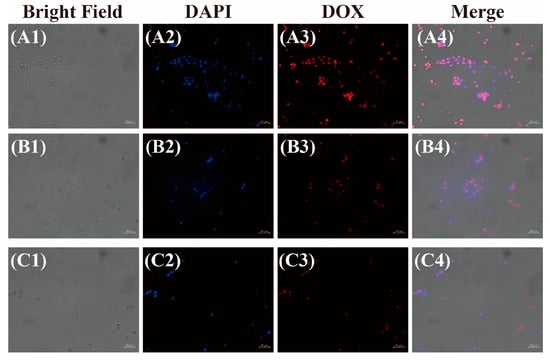 Fluorescence microscopy images of B16-F10 cells incubated with free DOX (A1–A4) and DOX-loaded NCLMs (B1–B4) and CLMs (C1–C4) for 4 h (Scale bar: 50 μm).