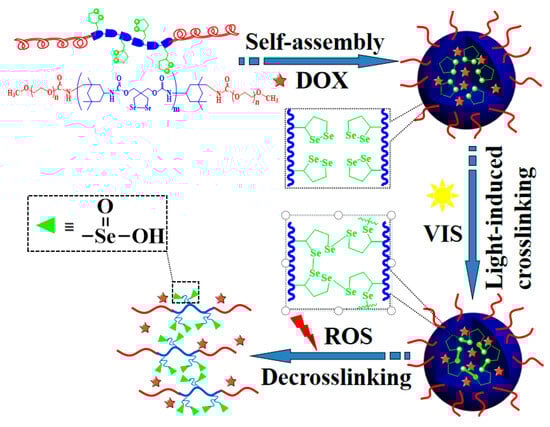 As an emerging building unit, diselenide bonds possessing redox dual sensitivity and dynamic covalent characteristics have been incorporated into various polymer architectures. These diselenide-based polymer systems have attracted growing attention as biomaterials and dynamic materials, including nanocarriers, hydrogels, and reverse materials. Particularly, by virtue of their exciting exchange reaction under mild visible light, these bonds have been widely explored and applied potentially in diverse types of smart materials, developed as interesting smart materials including self-healing, photo-patterning, and surface-modifying materials [42,43,44,45]. However, this visible-light-induced dynamic diselenide chemistry has seldom been adopted as a mild and efficient strategy to tune the stability of the nanomicelle systems via photo-crosslinking. Considering the multi-advantages of the photo-crosslinking method, such as in situ and mild synthesis, no crosslinker or extra reagent addition, no by-product generation, and no further purification requirement during the procedure, the visible-light-induced photo-crosslinking method is expected to be an effective approach for modulating the stability of polymeric micelles via dynamic diselenide exchange.