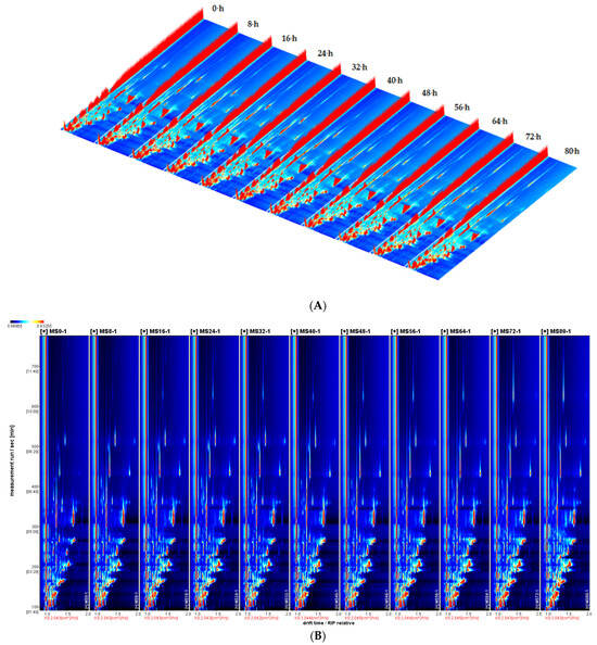 The complex composition of volatile compounds is indicated by the 3D topographic plots and 2D topographic plots of GC-IMS spectra shown in Figure 1. The vertical coordinate represented the retention time of gas chromatography(s), while the horizontal coordinate represented the ion migration time (a.u.). The red vertical line denotes the ion reaction peak (RIP peak), with each point on both sides representing a volatile compound [22]. From analyzing the 3D topographic plots, it can be observed that different constituents of volatile compounds are present in cottonseed oil at different frying times. Figure 1B provides a top view of the 3D topographic projected onto a 2D topographic plane. By examining the color intensity of the RIP peak, differences in composition and the concentration difference between volatile compounds in cottonseed oil at different frying times can be intuitively displayed through the 2D topographic (Figure 1B) plots.