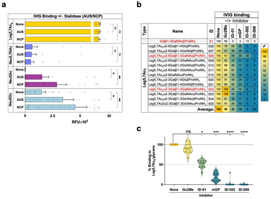 To gain further insight into human IgG immune recognition of Leg5,7Ac2, binding of IVIG to Leg5,7Ac2-glycans on the glycan microarray was examined in the presence of selected competing glycans, including methyl α-N-glycolylneuraminoside (2-O-methyl-αNeu5Gc, or Gc2Me), glycopeptides of diverse N/O-glycans produced from mice sera digestion (mGP) [46], and the glycans that showed top preference of binding on the arrays including glycans ID-51, ID-502, ID-508 (Core1β; Leg5,7Ac2α3Core1β; and Leg5,7Ac2α6Core1β, respectively; Figure 3a). This analysis revealed that only αNeu5Gc (Gc2Me) did not affect IVIG binding to Leg5,7Ac2-glycans, while all other glycans inhibited its binding (Figure 3b). Particularly, while IVIG binding to all Leg5,7Ac2-glycans was inhibited by 50% with Core1β (ID-51) and by 80% with mGP, the competing Leg5,7Ac2α3/6Core1β-glycans (ID-502/508) completely abolished it (Figure 3b,c). This suggests that human IgG is enriched with antibodies that recognize diverse Leg5,7Ac2-glycans, in which the Leg5,7Ac2 moiety is critical for their recognition, although with some promiscuity with the variation in the underlying glycans including Core1/Lactose/LacNAc. Based on these inhibition studies together with previous structural studies of antibodies against sialyl-Tn [54] and sialyl Lewis a (sLea) [55], it is plausible that the Leg5,7Ac2 moiety is buried within the binding pocket of these anti-Leg5,7Ac2 IgG antibodies.
