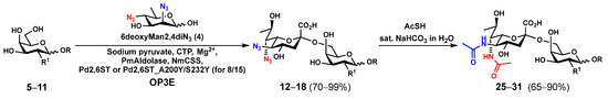 Similarly, the OP3E system containing PmAldolase, NmCSS, and PmST1_M144D [32] was used for the efficient synthesis of α2–3-linked Leg5,7diN3-glycosides (19–24) from galactosides 6–11, respectively, in 71–96% yields (Scheme 2). They were readily converted to the desired α2–3-linked Leg5,7Ac2-glycosides (32–37) in 67–75% yields using thioacetic acid in saturated sodium bicarbonate aqueous solution.