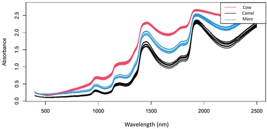 Figure 1 shows the raw near-infrared spectra of cow, camel and mare reconstructed milk samples in the spectral range of 400–2500 nm. Two major peaks were found around 1440 nm and 1950 nm representing the combination of the OH symmetric and asymmetric stretching modes of water and the combination region of the OH stretching and deformation vibrations of water [42]. An apparent difference can be seen between the raw spectra of the reconstructed milk samples, mainly due to their different chemical compositions.