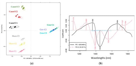 The bands representing the highest load in the separation of the groups of cow milk from the other ones are 1358, 1450 and 1664 nm (Figure 2b, PC1), while those contributing to the separation of the groups of camel and mare milk and their different concentrations are 1119, 1280, 1390, 1554, 1727 and 1764 nm (Figure 2b, PC2). The wavelength of 1280 nm is attributed to the first overtone bands of bonded OH-H [43,44]. The band at 1119 nm can be linked with the C-H stretch overtone [43]. Those at 1727 nm and 1764 nm can be assigned to fat and fatty acid absorption due to the first overtone of CH stretching vibrations [45,46]. In addition, 1390 nm was associated with lactose absorption as a result of O-H stretch/O-H bend combination vibration [47]. The band at 1450 nm was attributed to the first overtone of the OH stretching vibrations of water [46]. The band at 1554 nm can be attributed to the first overtone of stretching vibrations of the N-H bonds in amino groups [45,47,48,49], and 1664 nm to the first overtone of aromatic absorption (under C-H) groups [49,50].