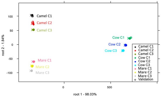 Figure 2a shows the PCA score plot of cow, camel and mare milk at three different concentrations. Based on the first two PCs (representing 99.14% of the total variance), a clear separation pattern among the types of milk samples can be observed. This was confirmed in the ANOVA tests as well, where significant differences among the reconstructed milk samples resulted from the type of milk powder. Moreover, the PC2 dimension showed a clear tendency to move apart groups of samples representing different levels of concentration except for the different concentrations of cow milk samples.