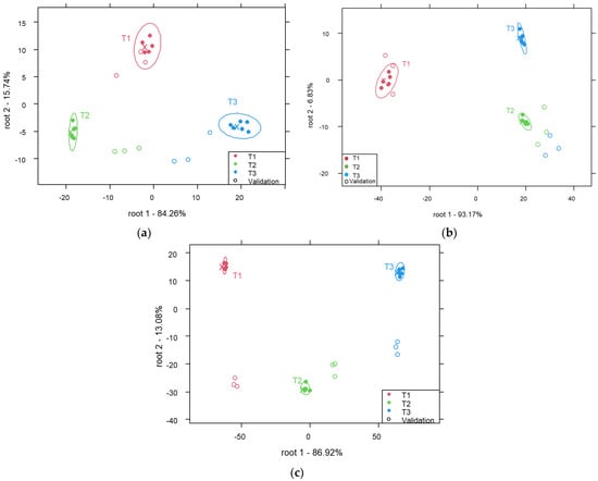 The mare milk model (Figure 4c) presented average recognition and prediction accuracies of 100% and 66.7%, respectively. After cross-validation, 33.3% of the samples prepared at T2 were incorrectly predicted as samples prepared at T3.