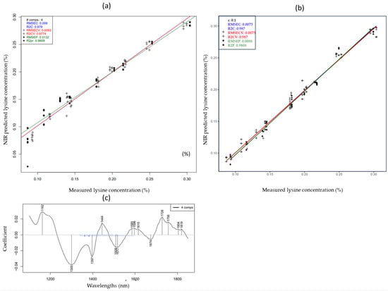 The lysine prediction model exhibited the highest accuracies among all measured amino acids. The corresponding PLSR and SVR models are shown in Figure 5. The wavelengths that contributed the most to the prediction of lysine using PLSR are shown in Figure 5c. Peaks located between 1330 and 1600 nm were attributed to the first overtone of O-H and N-H in amino groups [50].