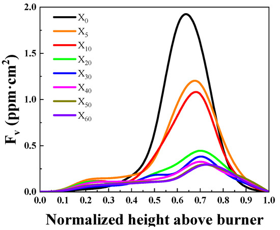 Figure 3 shows the overall change of soot concentration in the flame for X0–X60 conditions. From the figure, it can be seen that the total amount of soot in the cross-section is significantly reduced after ammonia mixing, and the maximum value of the total amount of the cross-section is shifted to the downstream of the flame. Initially, the maximum value of the total soot in the X0 flame appeared at the height of 0.6–0.7, and then, with the increase in the proportion of ammonia, the maximum value appeared moving to the right, and the maximum value of the X60 flame appeared at the height of 0.7–0.8.