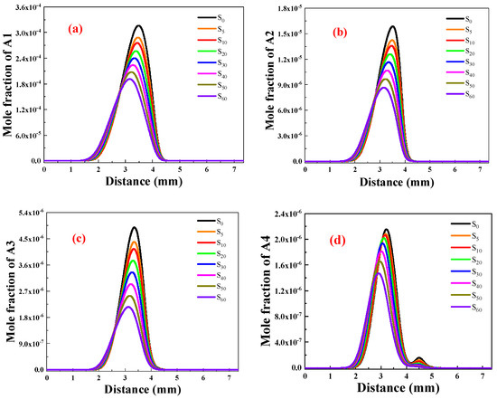 Figure 5b illustrates the A2 concentration distribution after adding different amounts of ammonia. Similarly to A1, the maximum A2 concentration decreases as more ammonia is added. Compared to the S0 flame without ammonia, the A2 concentration for S5–S60 decreased by 10.02%, 14.30%, 20.54%, 26.46%, 32.64%, 38.96%, and 45.23%, respectively, indicating that ammonia has a stronger inhibitory effect on A2 than on A1 due to the necessary participation of A1 in generating A2 and its inability to be fully converted into A2.