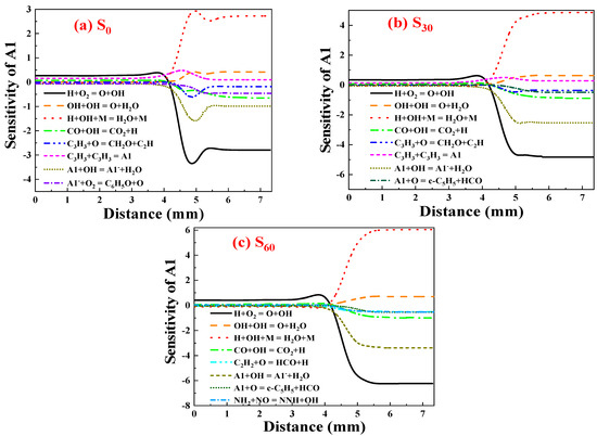 At 0–4.5 mm, the most favorable reaction for the formation of A1 is H + O2 = O + OH. As in the fuel-rich region, oxidants like O and OH function to activate the reaction substances involved in A1 production, favoring the production of A1. When 30% ammonia is added, H decreases, making the sensitivity coefficient of H + OH + M = H2O + M greater at 4.5–7.35 mm compared to when ammonia is absent, influencing A1 formation further. Also, due to the decrease in H, the absolute value of the sensitivity coefficient of the H + O2 = O + OH reaction increases. When H decreases, this reaction produces more O and OH, thus enhancing its effect on A1 consumption. Due to an increase in substances to be activated on the fuel side following the addition of ammonia and the decrease in H, the sensitivity coefficient of H + O2 = O + OH increases below 4.5 mm. This indicates that the reaction is more critical for A1 formation.