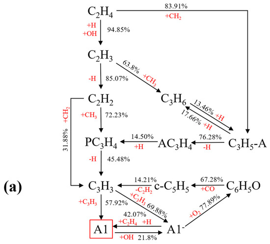 Figure 8a–c show the simplified reaction pathway from C2H4 to A1 with 0%, 30%, and 60% ammonia added. The numbers on the pathway indicate the contribution rate of the initial substance to the final product, obtained by integrating the material product rate. During combustion, C2H4 reacts with H and OH to form C2H3, which then dehydrogenates to produce C2H2. This further reacts with CH3 to generate propylene diene (PC3H4). PC3H4 dehydrogenates to form C3H3, which then undergoes direct addition to form A1 or A1−. A1− is converted to A1 through hydrogenation. Therefore, production of A1 mainly comes from A1− and C3H3, following this reaction formula: