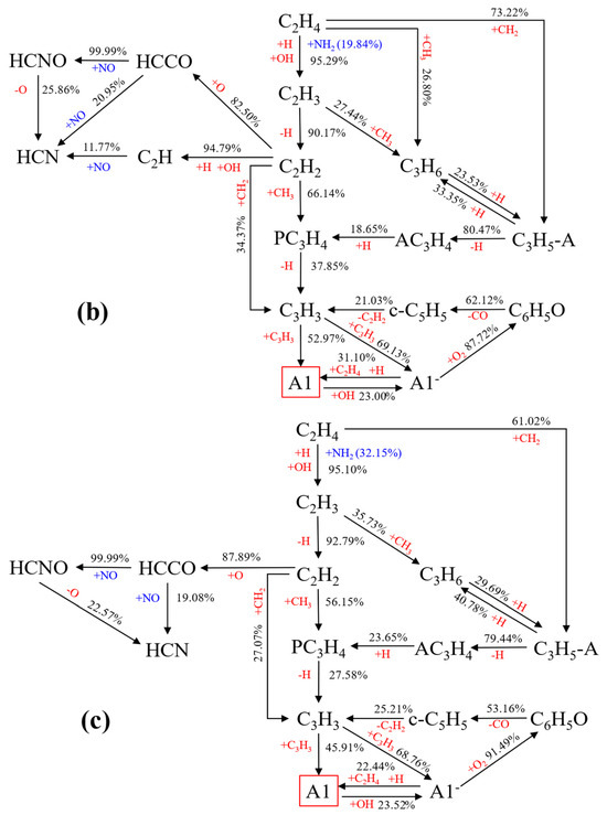 Simplified reaction pathway from C2H4 to A1 with the addition of ammonia: (a) 0%; (b) 30%; (c) 60%.