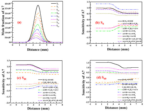 Figure 9 illustrates the distribution of A7 concentrations and the sensitivity coefficient. The sensitivity coefficient of A7 was changed after adding 0%, 30% and 60% ammonia. It can be seen from the diagram that the largest reaction affecting the formation of A7 without ammonia is the dehydrogenation reaction of A4 to form A4-4, and the largest impact on the consumption of A7 is also the dehydrogenation reaction of A4, but the reaction product is A4-2, in which A4-4 and A4-2 are isomers. This indicates that the role of different isomers in the formation and consumption of A7 is also very different. After adding 30% ammonia, the effect of reaction H + O2 = O + OH on the formation of A7 gradually increased, indicating that the addition of ammonia reduced H, which inhibited the formation of PAHs, and the formation of A7 was also inhibited. For 60% ammonia, the effect of the reaction between H and O2 on the formation of A7 is further increased, which means that when ammonia is added to the ethylene flame, the greatest impact on PAHs is the change in H concentration. The more ammonia added, the smaller the concentration of H in the flame, and the more the formation of PAHs will be inhibited.