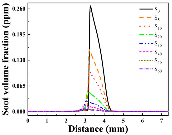 Figure 10 displays the distribution of soot volume fraction variation with the addition of ammonia. For the case without ammonia, soot particle formation begins at approximately 4.5 mm, and then rapidly decreases towards zero. Following the addition of ammonia, the soot concentration significantly decreases, with the peak values for the S0–S60 flame being 0.275, 0.159, 0.102, 0.0505, 0.0266, 0.0143, 0.00788, and 0.00436 ppm, respectively.