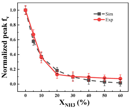 Normalized maximum soot volume fraction by simulation and experiment after ammonia addition.