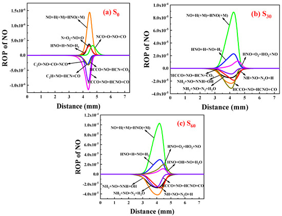 Figure 13 displays the ROP distribution of each NO reaction after doping with 0%, 30%, and 60% ammonia. It shows the top eight absolute values of the reaction rate magnitude, where positive values indicate NO generation and negative values indicate NO consumption.