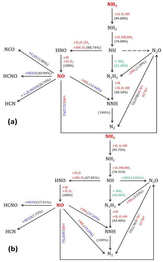 In hydrocarbon flames, the addition of NH3 in the fuel stream led to a significant increase in NO levels in C2H4-NH3 flame [41]. Figure 14a–c illustrate simplified reaction paths for NO generation with 10%, 30%, and 60% ammonia blending, respectively. The numbers on the paths indicate the contribution of each substance to the generation of NO, obtained by integrating substance product rates and comparing them.