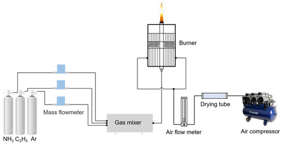 Table 1 shows the experimental parameters in this study. C2H4, NH3, and Ar (purity > 99.99%) were used as fuel and dilution gas. During the experiment, the C2H4 flow rate was fixed at 180 mL/min, and different proportions of NH3 were used instead of Ar to eliminate the effect of dilution. The experimental NH3 mixing ratios were set at 0%, 5%, 10%, 20%, 30%, 40%, 50%, and 60%, which were marked as X0, X5, X10, X20, X30, X40, X50, and X60, respectively. The compressor supplies the oxidizer for combustion at a fixed flow rate of 100 L/min.