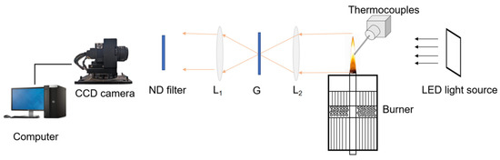 The soot concentration was deduced by analyzing and processing the light intensity. A light source was used to emit light of a specific wavelength to the surface of the measured object. As shown in Figure 16, the light extinction measurement system consists of an LED light source that emits collimated light, two plano-convex lenses (L1 and L2), a pinhole grating (G), a neutral density (ND) filter (15% transmission), a CCD camera, and a computer. The CCD camera array size is 964 × 92 pixels with a pixel size of 200 μ, and a set speed of 30 frames per second and an exposure time of 5000 μs were used in the experiment. The light source is a flat LED light-emitting panel that produces a stable parallel light and can completely cover the entire flame height to ensure accuracy of the measurement results. L1 and L2 are a pair of identical plano-convex lenses whose surfaces are opposite each other. The light passing through the flame is focused by lens L2 at the small hole grating (G). As light passes through the L1 and ND filters, LED light and flame light are captured by the CCD camera. More information has been mentioned in previous studies [36,38]. In order to ensure the accuracy of the experiment, all experiments were repeated at least three times.