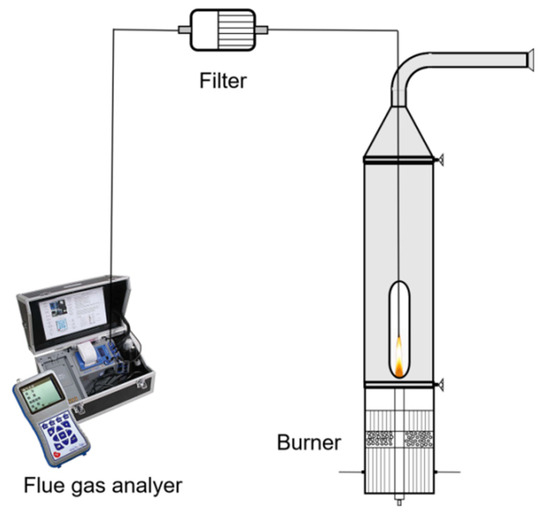 The flue gas sampling system is shown in Figure 17. The sampling tube is made of stainless steel with a diameter of 2 mm, and the flue gas analysis is carried out using an ECOM-J2KN flue gas analyer made in Iserlohn, Germany, capable of measuring NO, O2, CO, and other gases. The O2 measurement concentration range is 0–21% vol, with an accuracy of 0.2 vol and a resolution of 0.1%. The NO concentration measurement range is 0–2000 ppm, with an upper limit of 5000 ppm, a measurement error of 5 ppm, and a resolution of 1 ppm. The CO measurement range is 0–4000 ppm, with an upper limit of 10,000 ppm, an accuracy of 5 ppm, and a resolution of 1 ppm. Therefore, the flue gas analyzer meets the requirements of this experiment.