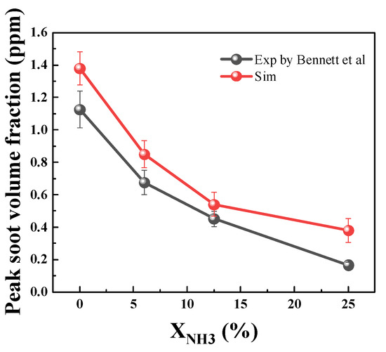 The accuracy of the mechanism needs verification upon completion of its integration. Figure 18 shows the comparison of the simulation results and the experimental results of Bennett et al. [22] using the same ammonia doping ratios. In the figure, a large difference between the simulation and experimental results is observed for the undoped ammonia condition, which gradually decreases after ammonia doping. The upper limit of error between the simulated and experimental results for unadulterated ammonia is 13.9%, but there is also a larger experimental error range at this time. The difference between the simulation with 12.5% ammonia and the experimental results is smaller, at 9.2%, indicating better simulation results at this point. At 25% ammonia doping, there is a larger difference between the experimental and simulated results. However, considering that soot concentration is very low at this time, the absolute change in soot concentration is even lower compared to the lower-ammonia-percentage doping conditions. In conclusion, it can be stated that both the reaction mechanism and soot growth model effectively reflect actual experiment trends.