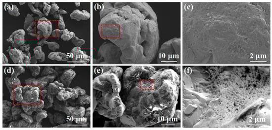 The Fe/PTFE composite powders were fabricated by mixing raw iron powders and different amounts of PTFE powders (0 wt%, 1 wt%, 2 wt%, 3 wt%, 4 wt%, and 5 wt%) through ball milling (see Materials and Methods and Supplementary Materials for experimental details). Figure 1 shows the surface morphology of the raw iron powders and ball-milled Fe/PTFE composite powders containing 3 wt% PTFE at different magnifications. The raw iron particles exhibit relatively good dispersion and a smooth and clean surface (Figure 1a–c). The Fe/PTFE composite powders appear aggregated to some extent. The surface of the composite powders tends to become rougher and exhibits obvious floc aggregates. The floc aggregates are composed of small spherical particles (Figure 1d–f). These results confirm that a relatively thick insulating layer formed on the surface of the iron particles.
