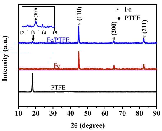 To further confirm the phase structures of the insulating layer on the surface of the iron particles, an XRD pattern of the Fe/PTFE composite powders containing 3 wt% PTFE (blue line in Figure 2) was carried out. For comparison, XRD patterns of the raw iron powders (red line in Figure 2) and PTFE powders (black line in Figure 2) were also measured. As can be observed, the raw iron powders show three obvious characteristic peaks centered at 44.7° (110), 65.0° (200), and 82.3° (211), respectively, which correspond to the α-Fe phase (JCPDs Card: 99-0064). For the Fe/PTFE composite powders, a new characteristic peak occurs at 18.1° (100), which is consistent with the standard characteristic peak of PTFE (JCPDs Card: 54-1595). The appearance of the characteristic peak proves the presence of PTFE. Combined with SEM images of the Fe/PTFE composite powders containing 3 wt% PTFE (Figure 1d–f), these results confirm that a PTFE insulation layer is successfully coated on the surface of the iron particles.