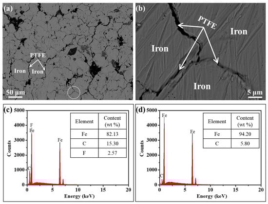 The Fe/PTFE composite powders containing 3 wt% PTFE were compacted at 648 MPa, followed by annealing at 150 °C for 90 min to obtain Fe/PTFE SMCs (see Materials and Methods and Supplementary Materials for experimental details). To investigate the microstructure, especially the distribution of the PTFE insulating layer in Fe/PTFE SMCs, back-scattered electron images of the cross-sectional structure of the Fe/PTFE SMCs coated with 3 wt% PTFE were carried out. Figure 3a gives the morphology of the cross- section for the Fe/PTFE SMCs coated with 3 wt% PTFE. Figure 3b is a partial magnification corresponding to the white circle in Figure 3a. It can be seen that the iron particles are separated from each other by a PTFE insulating layer. The corresponding EDS spectra of the PTFE insulating layer and iron particles for the Fe/PTFE SMCs coated with 3 wt% PTFE are shown in Figure 3c,d. It is clear that the iron content decreases while the C content increases and the F content appears at the interface between iron particles, which indicates that the surface of the iron particles is covered by a PTFE insulating layer.