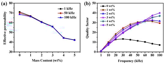 (a) Effective permeability of Fe/PTFE SMCs as a function of PTFE contents at three different frequencies; (b) quality factor of Fe/PTFE SMCs with different PTFE contents versus frequency.