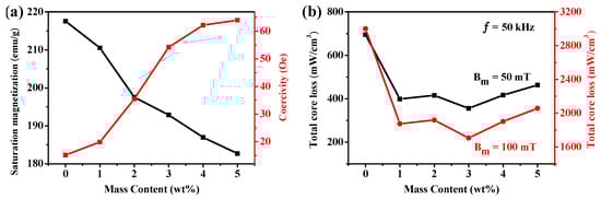 (a) Saturation magnetization (black line) and coercivity (red line) of Fe/PTFE SMCs containing different PTFE contents at a magnetic field of 20,000 Oe; (b) total core loss of Fe/PTFE SMCs with different PTFE contents measured at 50 kHz for Bm = 50 mT and 100 mT, respectively.